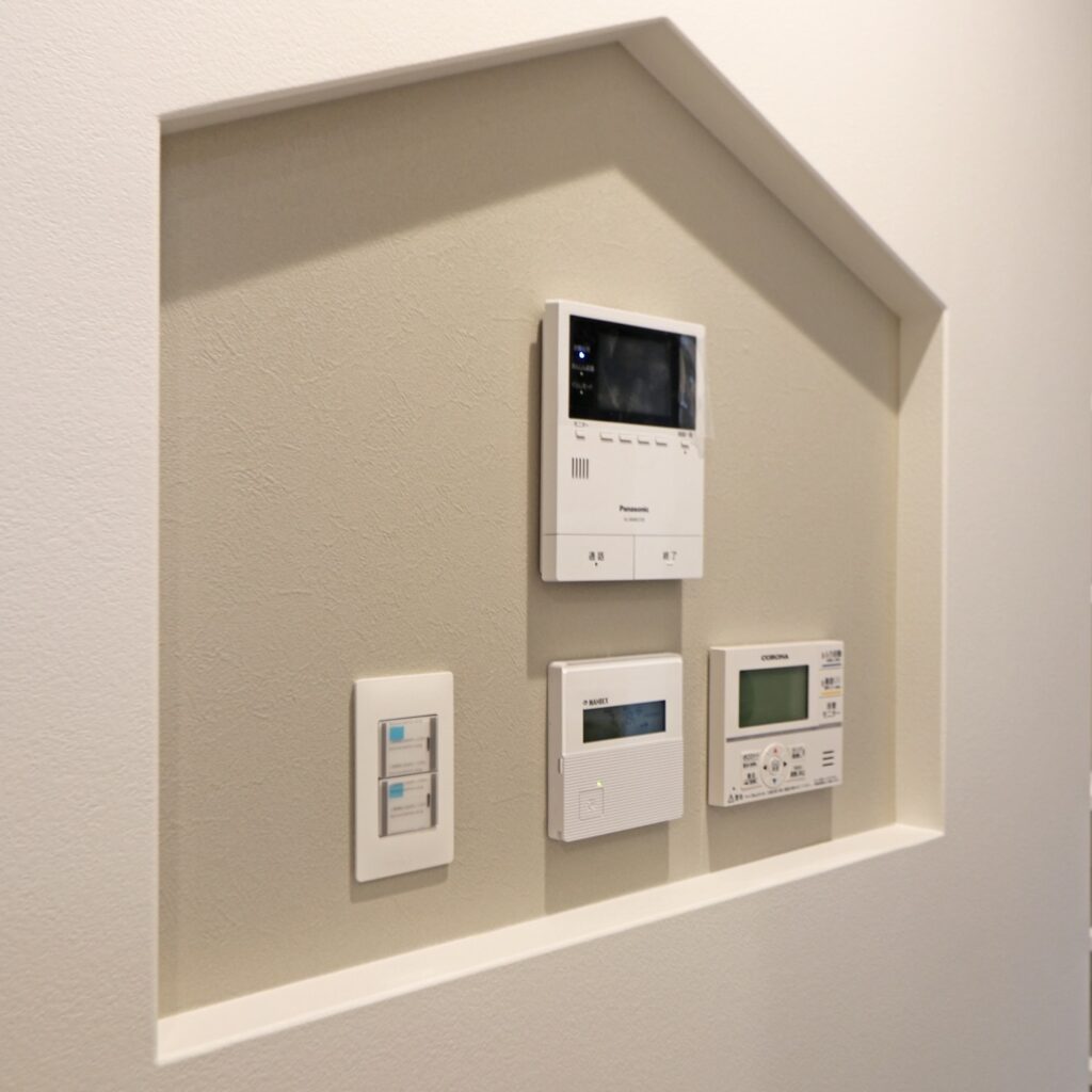 雑多になりがちなリモコンたちは、家型のニッチでかわいくおまとめ。