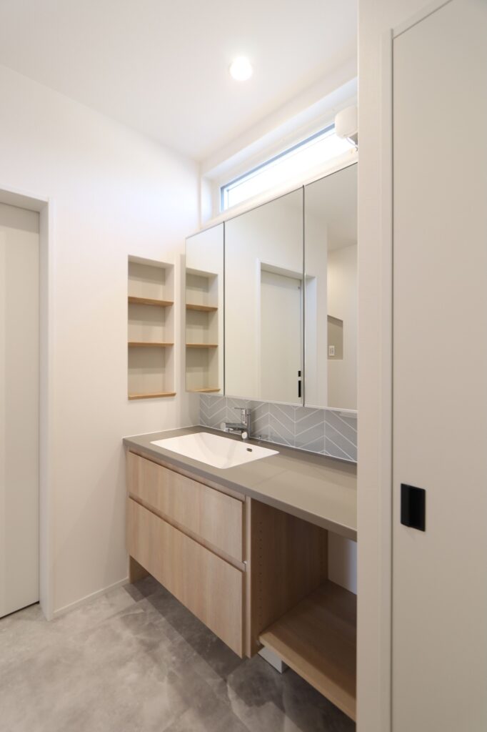 タオルなどを収納できる可動棚も造り付けており、収納力もバッチリ!