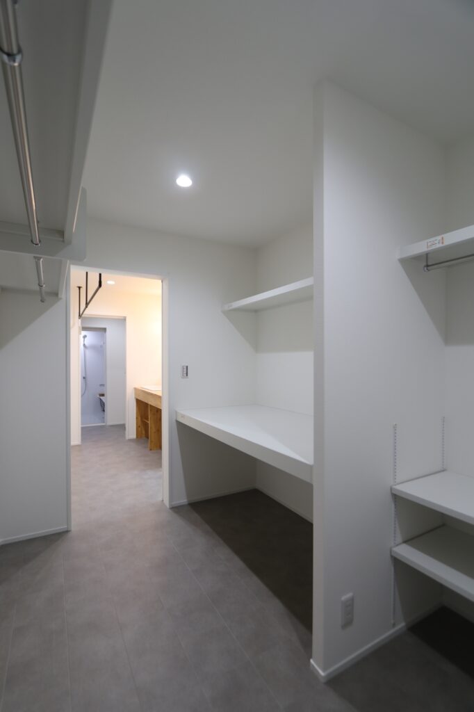 大容量のファミリークローゼットには、広いカウンターを設置しました。