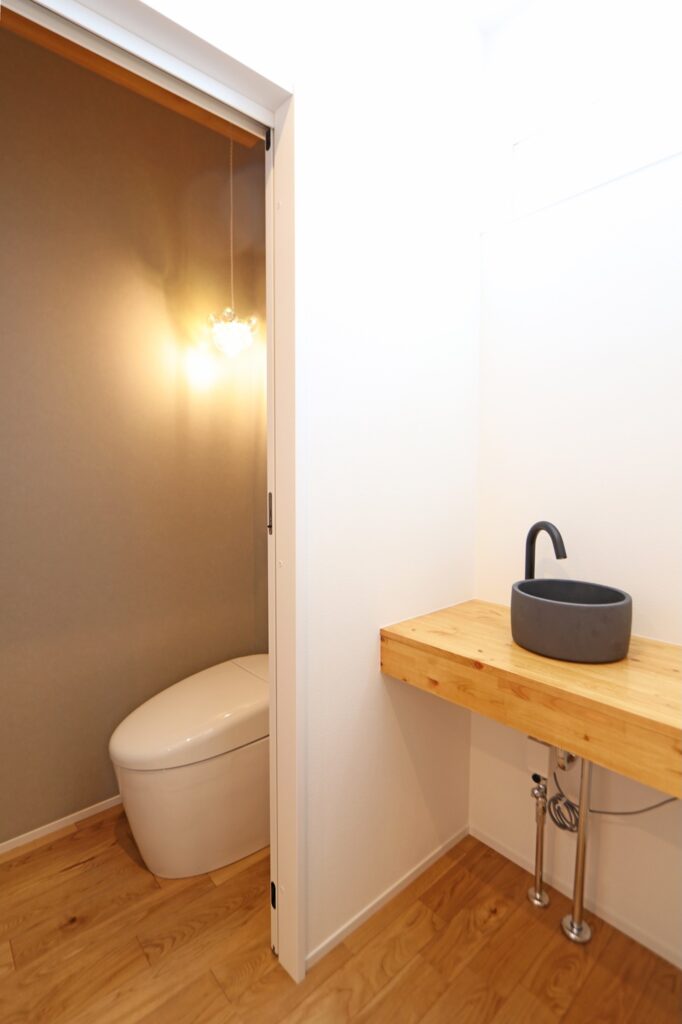 浴室側のトイレは家族専用、玄関側のトイレはゲスト用としても使用できるよう、かわいい手洗いを作り付けました。
