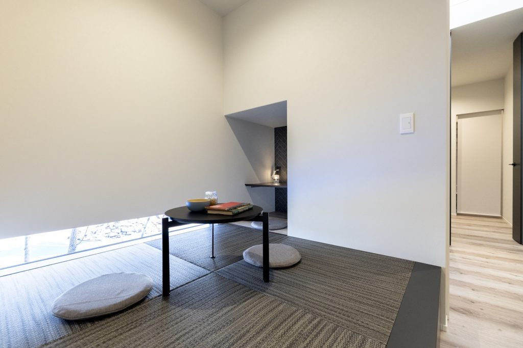 LDK横の畳スペースに設置した地窓から、玄関先の植栽がのぞくくつろぎ空間。