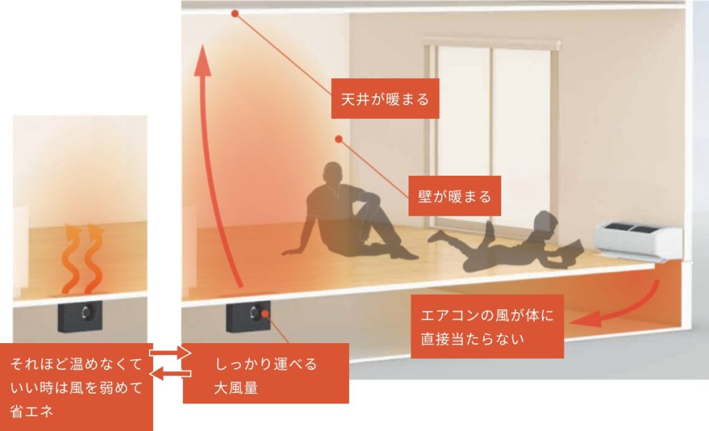 エアコンの暖気を床下に送り、大風量の床ファンで各部屋へ循環させる仕組みです。