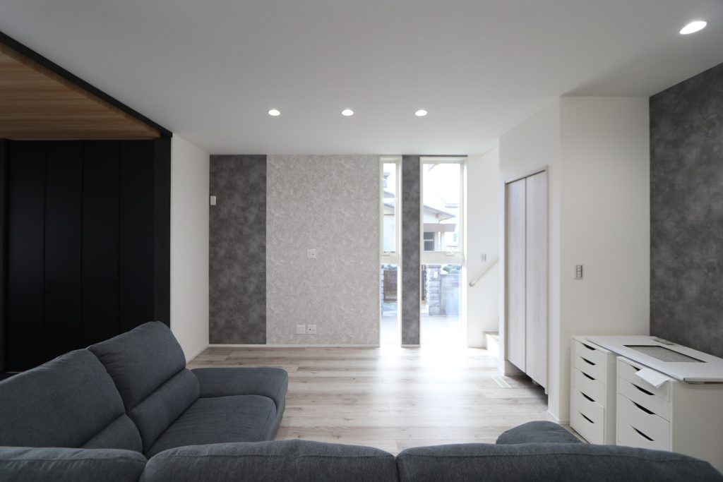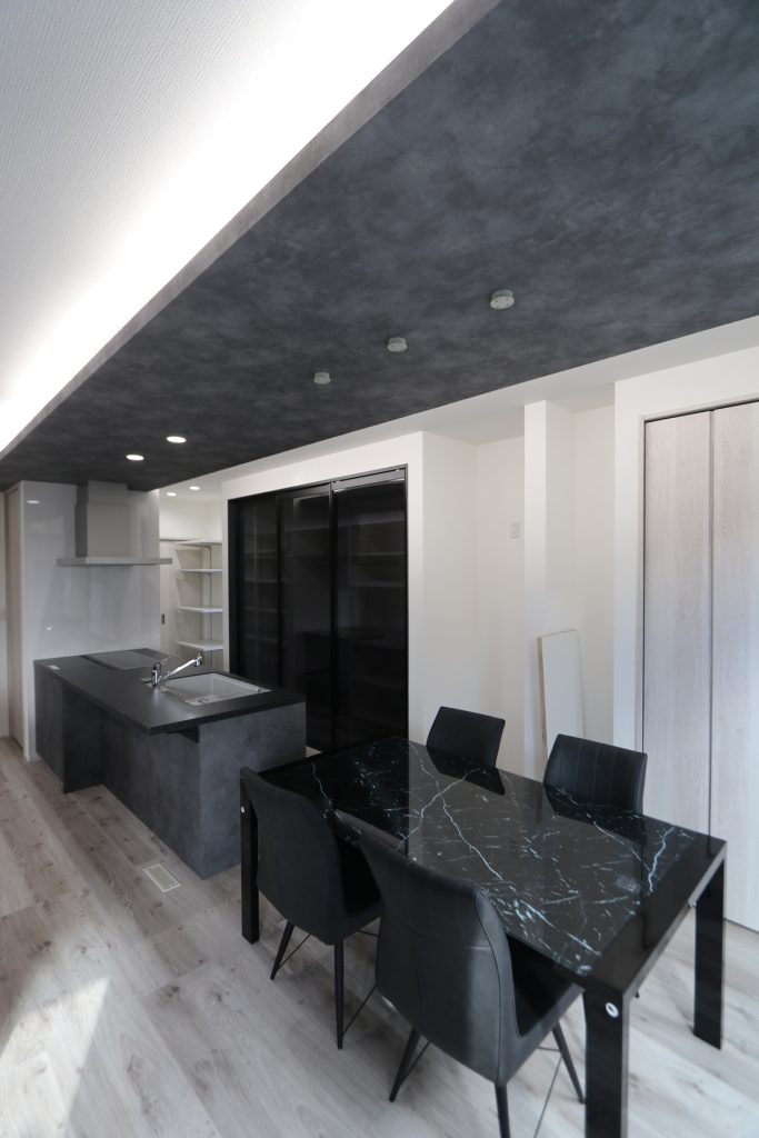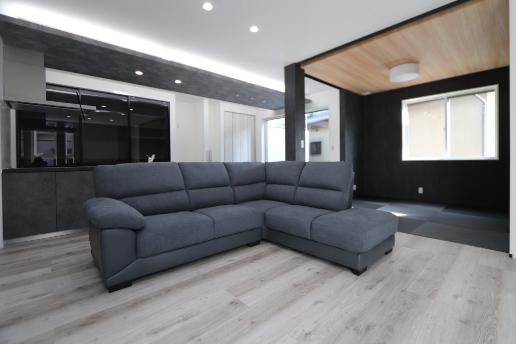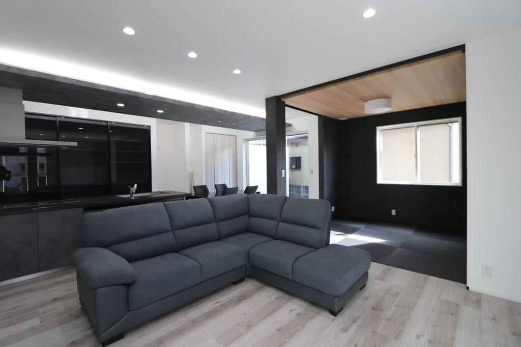 畳スペースや家具類もブラックとグレーで揃え、床色もグレイッシュがかった色味を選ばれました。