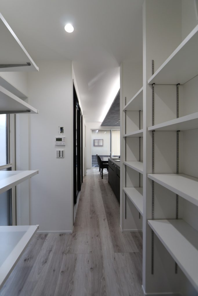 大容量のパントリーを備え、家事負担を減らす工夫もしています。