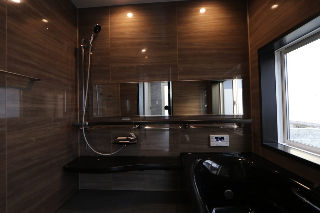 浴槽とカウンターにもブラックを採用し、横長の大きな鏡や全面に木目調パネルで上質感を演出しました。