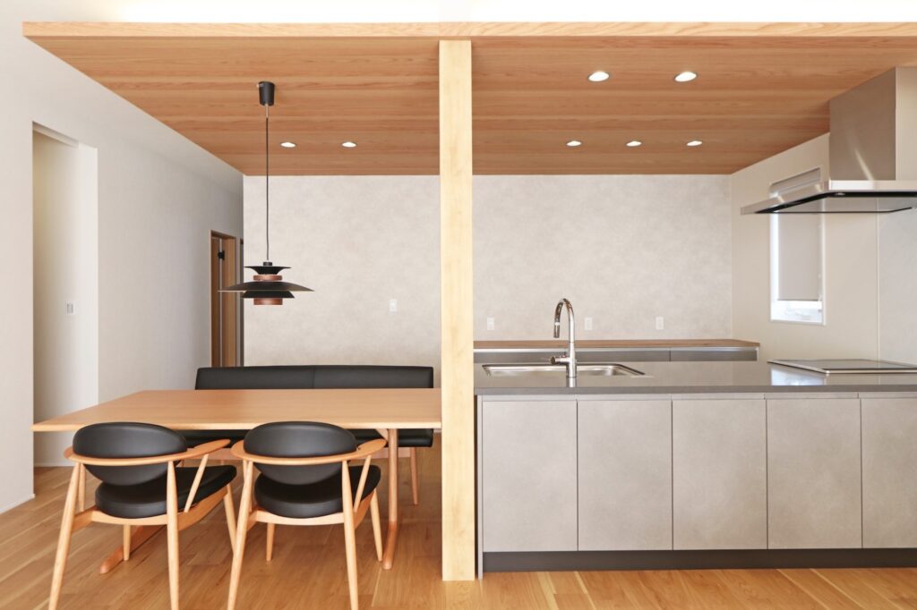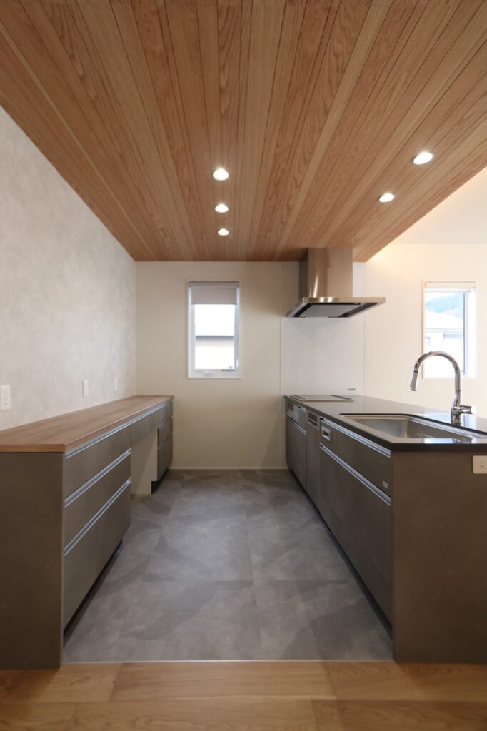 キッチンは木目とも相性の良いライトグレーに。