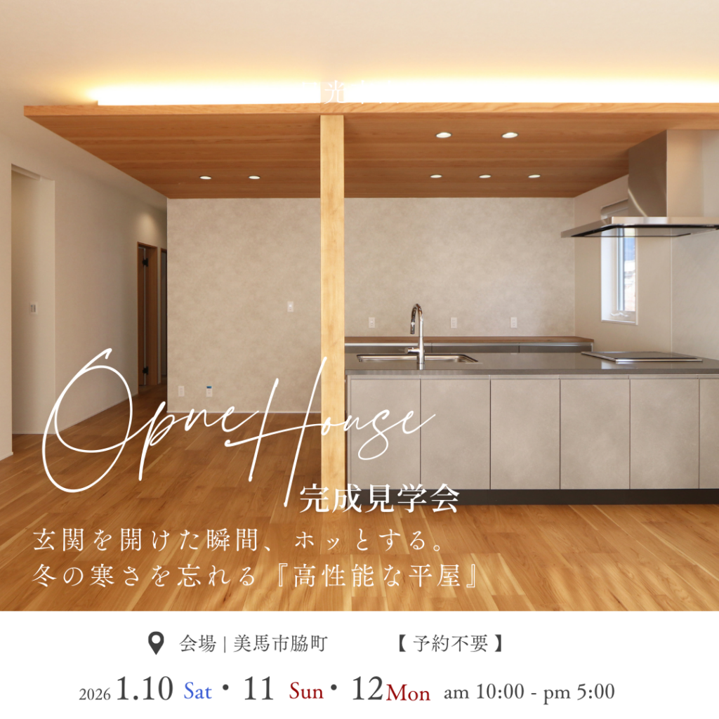 「玄関に入った瞬間、あたたかさにホッとする」 そんな理想の住まいが、美馬市脇町に完成しました。お施主様のご厚意により、お引渡し直前の3日間限定で公開いたします。