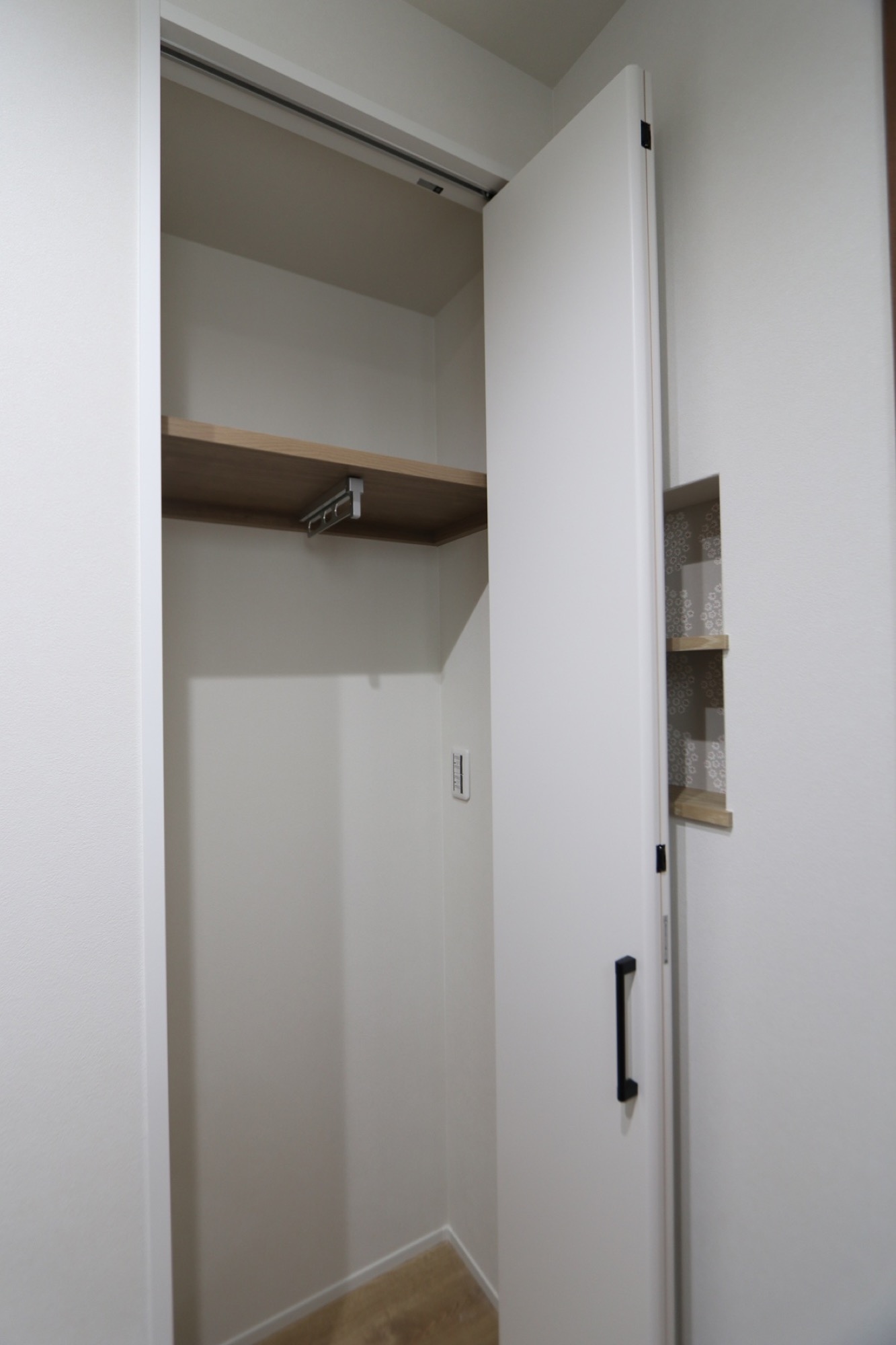 クローク内にはコート掛けも備え付けられており、靴からアウター、帽子などもまとめて収納できるため、