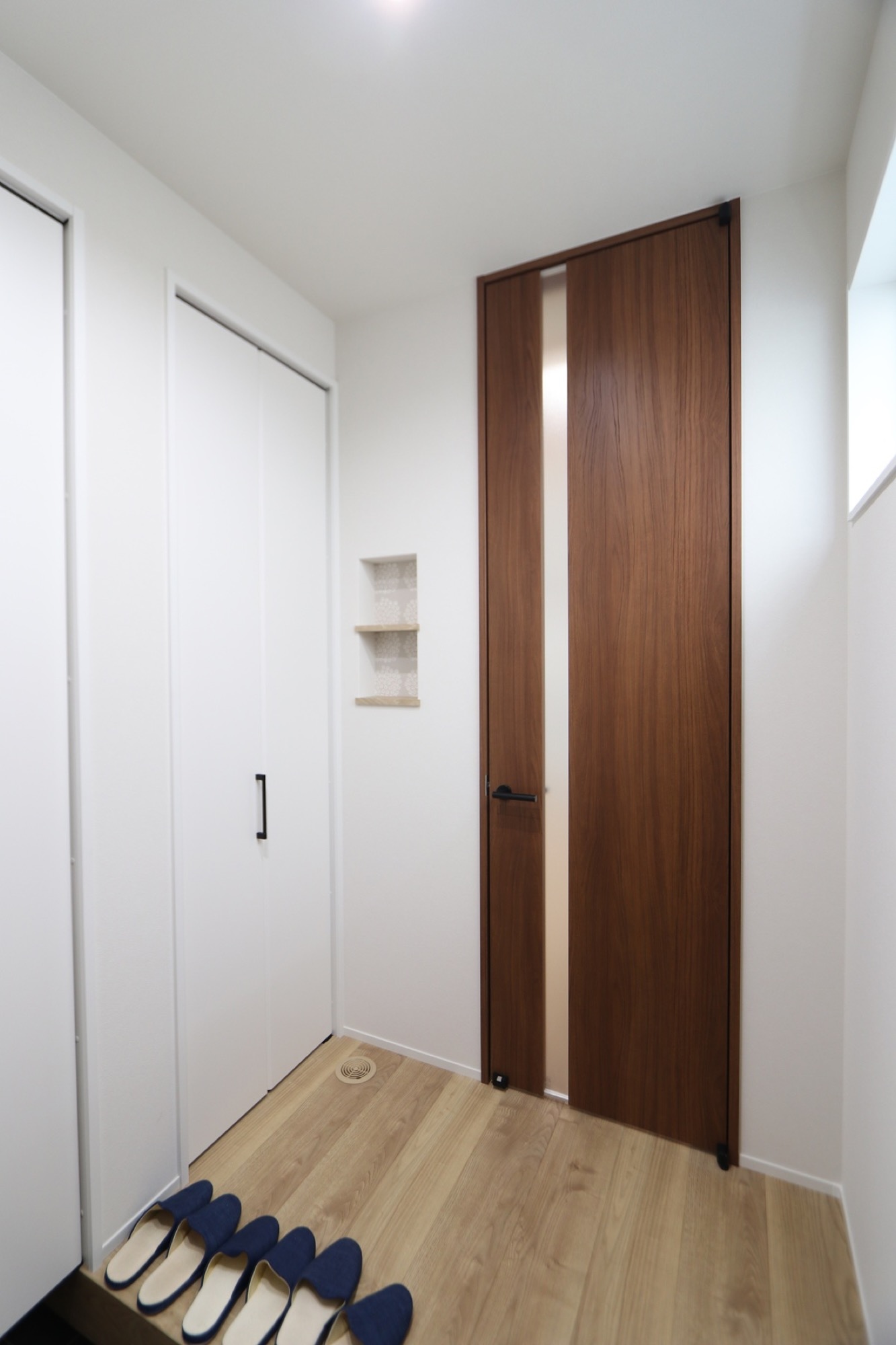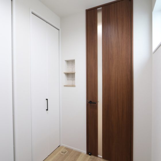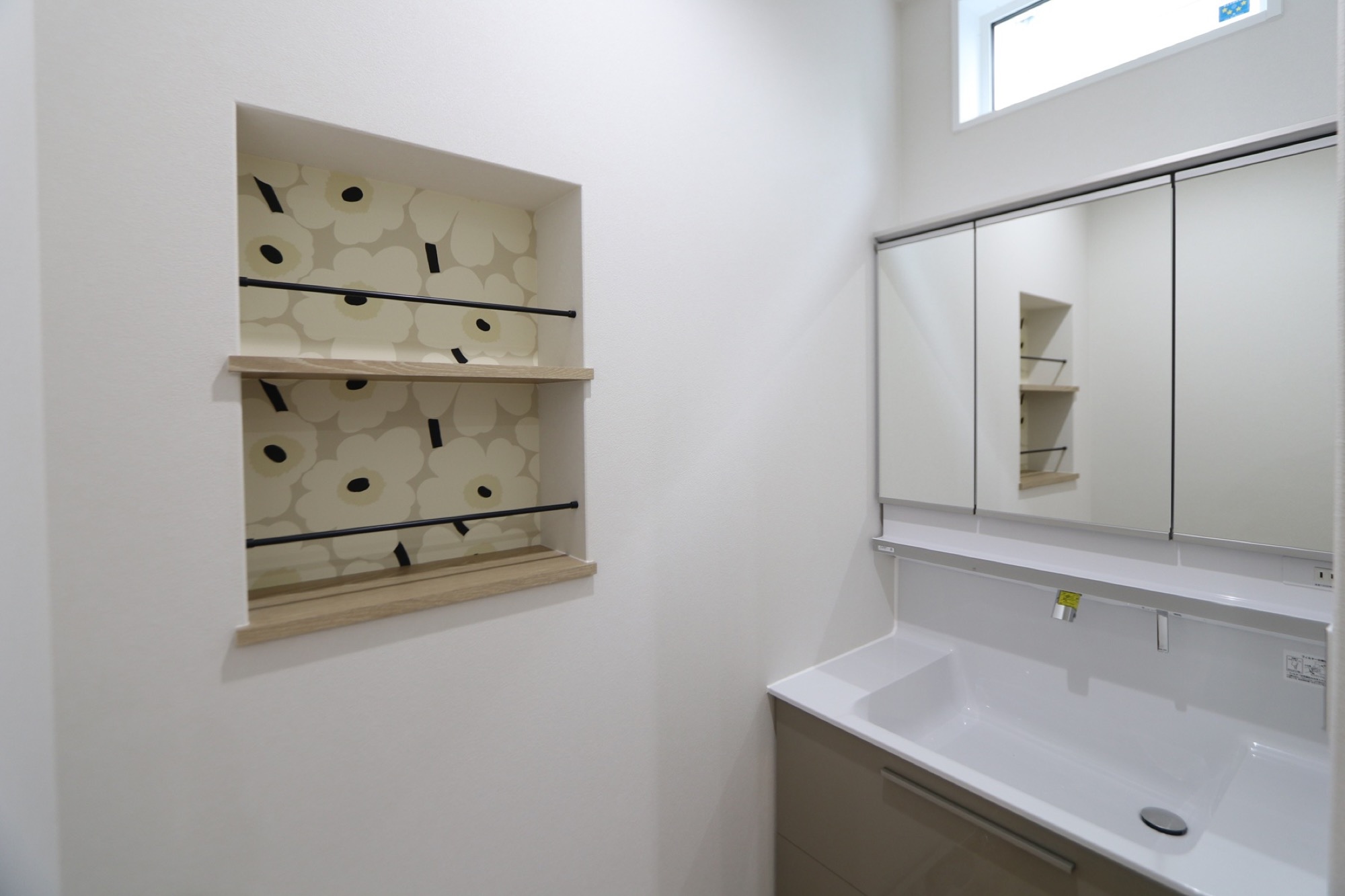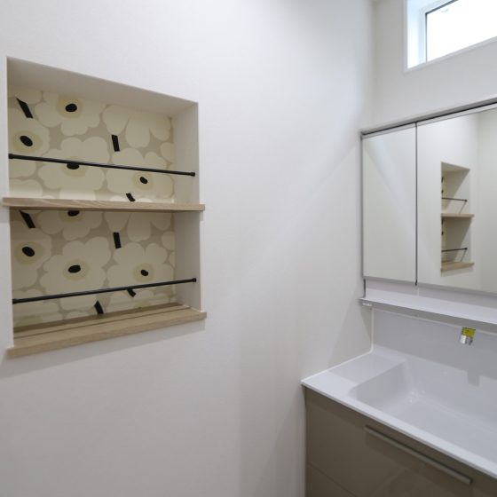 壁にタオルを丸めて収納できるニッチも設け、明るくおしゃれな雰囲気になりました!