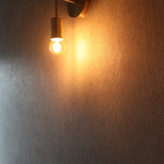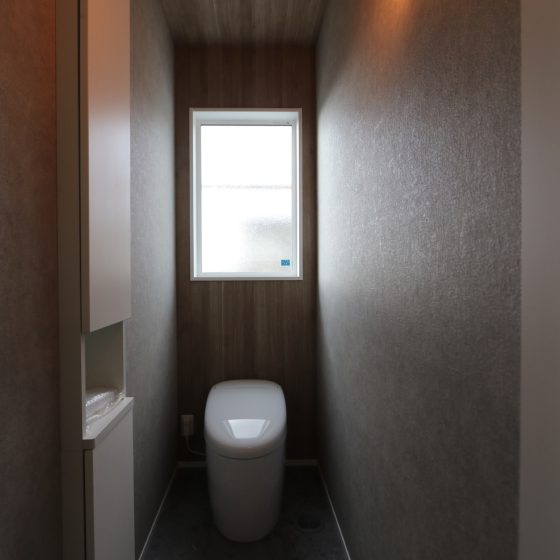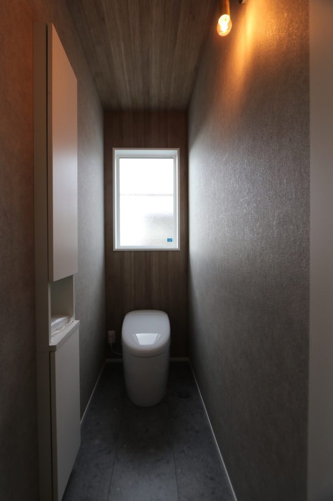 お家の中で唯一、1階のトイレだけはグレー系や深みのある木目調を使い、シックで落ち着いた空間に仕上げました。温かみのあるブラケットライトが、おしゃれなアクセントになっています。