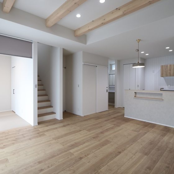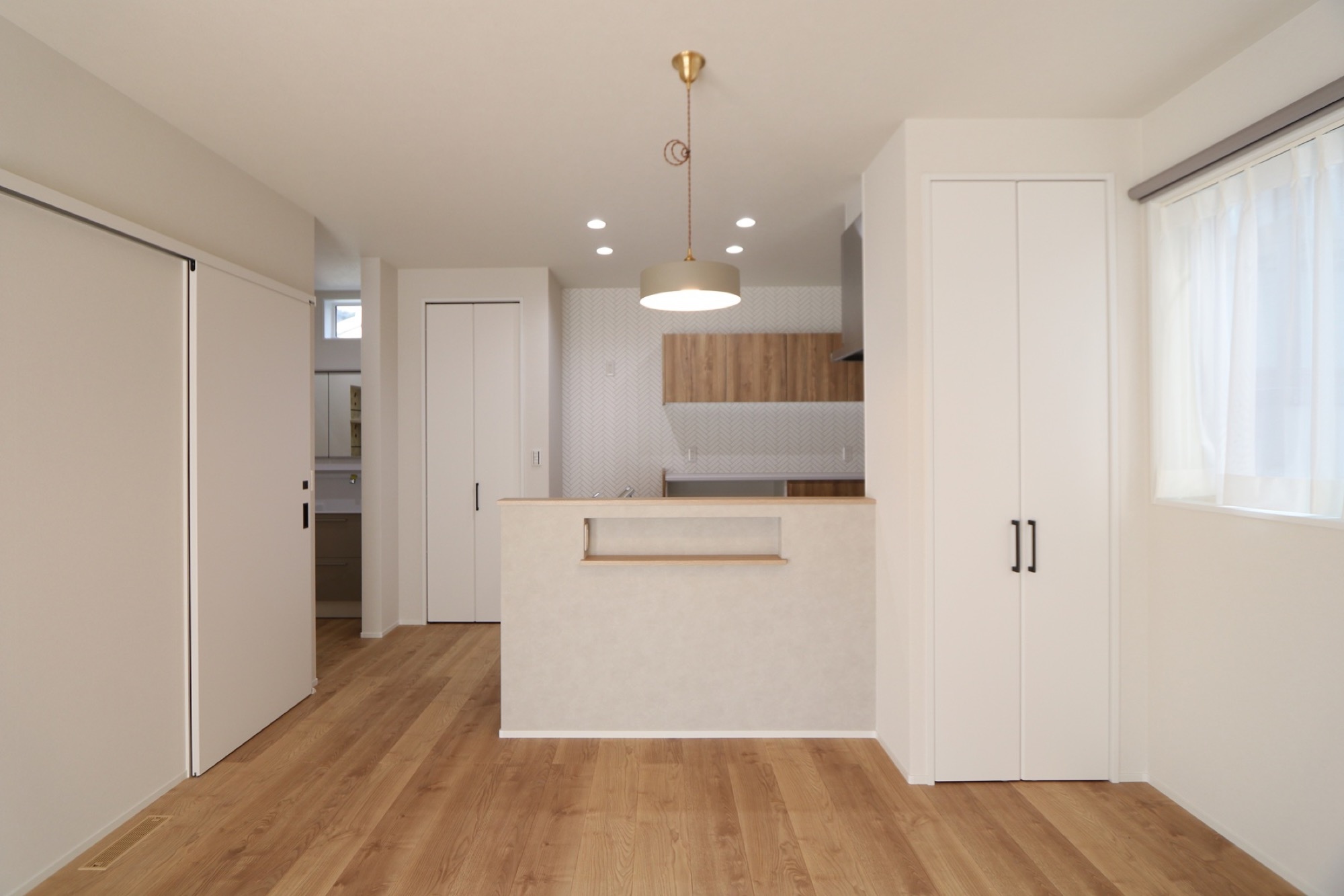 17.3帖のLDKは、ホワイトインテリアが魅力の明るく洗練された空間です。
