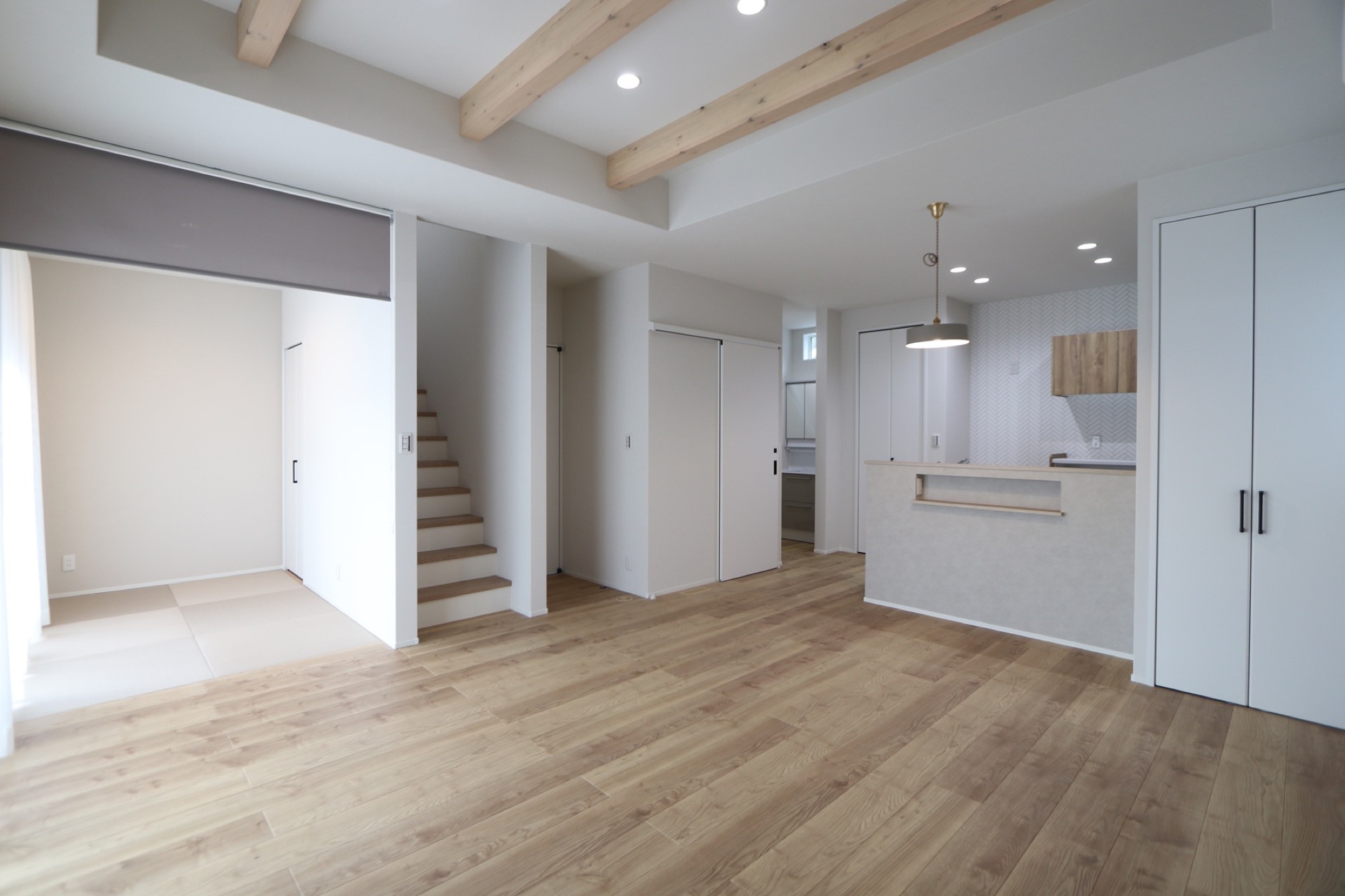 さらに、リビングの天井を高くし、3帖の畳スペースを設けることで、17.3帖という広さ以上に開放的に感じられます。リビング天井の化粧梁も印象的!