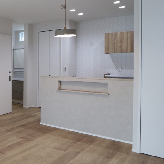 腰壁を高めにすることで、リビング側から手元が見えずスッキリした印象になりました。
